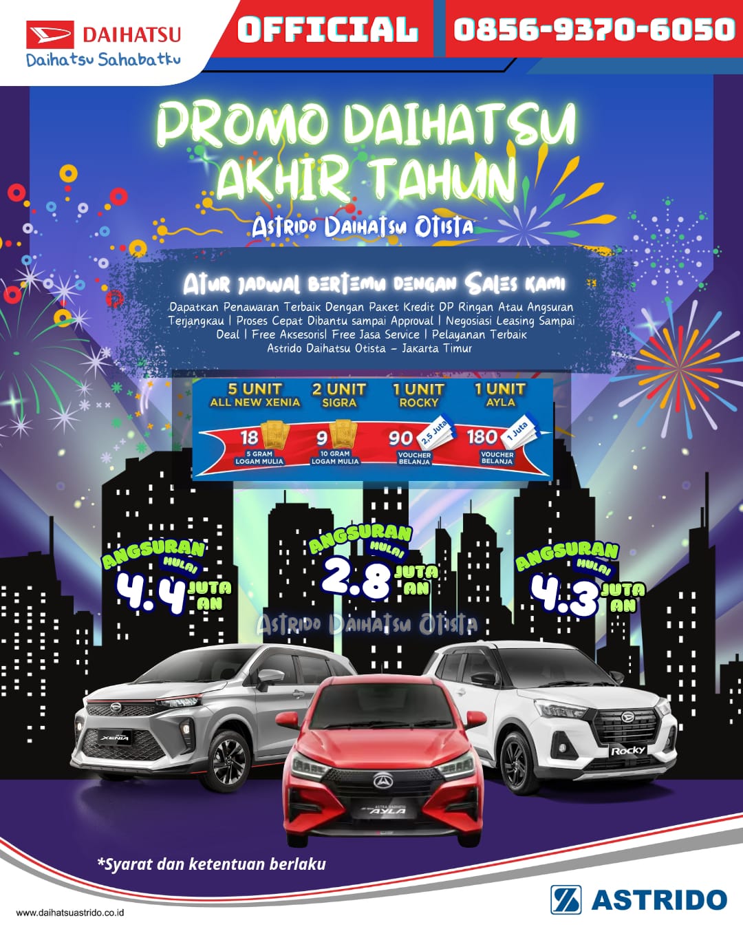 Astrido Daihatsu Jakarta kembali hadir dengan penawaran paling GILA yang akan membuat akhir tahun Anda semakin istimewa! Lupakan proses rumit dan cicilan mahal, karena promo Daihatsu Jakarta akhir tahun ini menjamin Anda mendapatkan mobil impian dengan segala kemudahannya plus BANJIR HADIAH LOGAM MULIA & VOUCHER yang totalnya mencapai ratusan juta rupiah