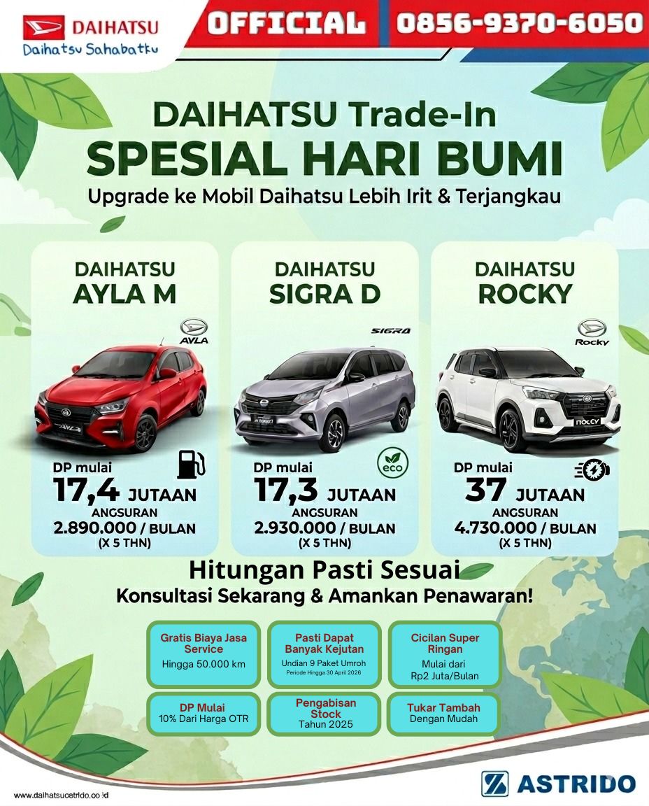 Bulan April 2026 ini adalah momen paling tepat untuk menyegarkan garasi Anda. Memperingati Hari Bumi, Daihatsu Astrido menghadirkan program tukar tambah Daihatsu Jakarta yang dirancang khusus untuk Anda yang menginginkan kendaraan lebih ramah lingkungan, irit bahan bakar, namun tetap ramah di kantong. Bersama Astrido Jakarta Timur, proses trade-in kini jauh lebih praktis, transparan, dan pastinya menguntungkan.